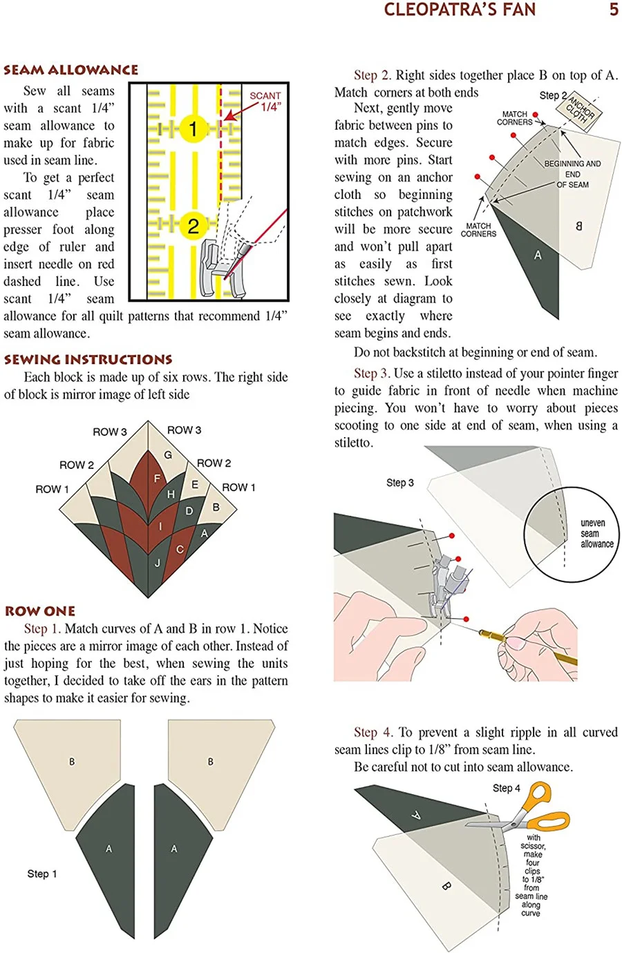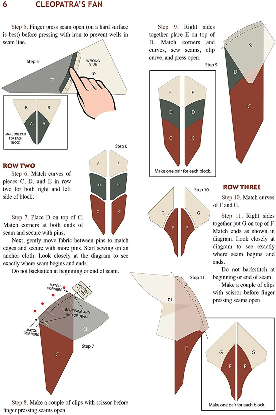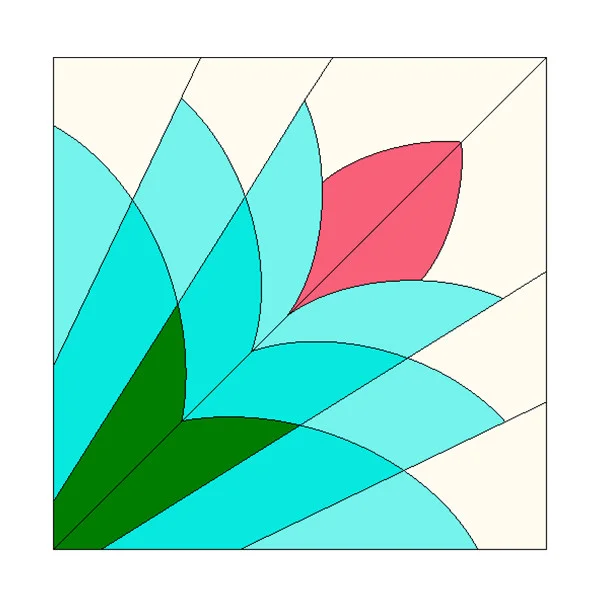 This classic quilt is made of blocks with fabric applied or pieced in a series of irregular "petals". Sew all seams to get a square. Each block is made up of six rows. The right side of block is mirror image of left side.