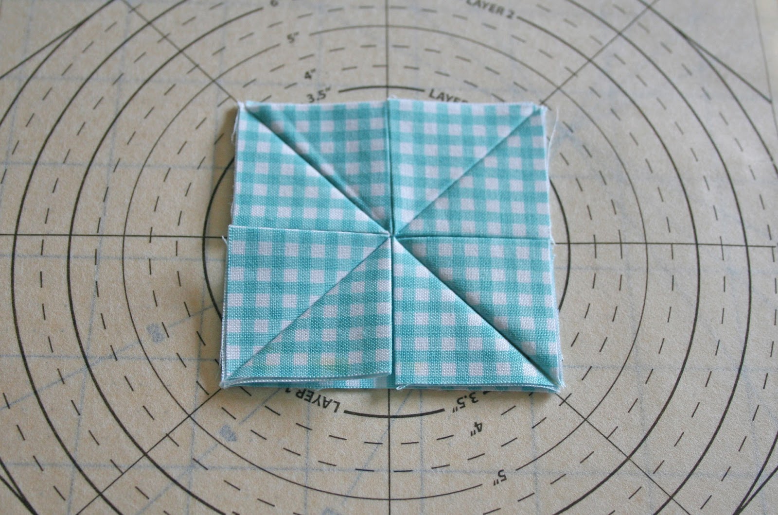 1.To make the prairie points fold it in half once, wrong sides together and press. Then fold the two corners to the middle and press with steam so it stays in place.